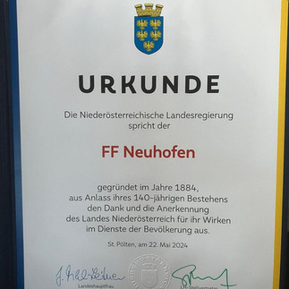 Bei einem feierlichen Festakt wurden 152 Feuerwehren für ihr langjähriges Engagement geehrt. Unter ihnen die Freiwillige Feuerwehr Neuhofen an der Ybbs, die von Landeshauptfrau Mikl-Leitner und LBD Dietmar Fahrafellner eine Ehrenurkunde für ihr 140-jähriges Bestehen überreicht bekam.